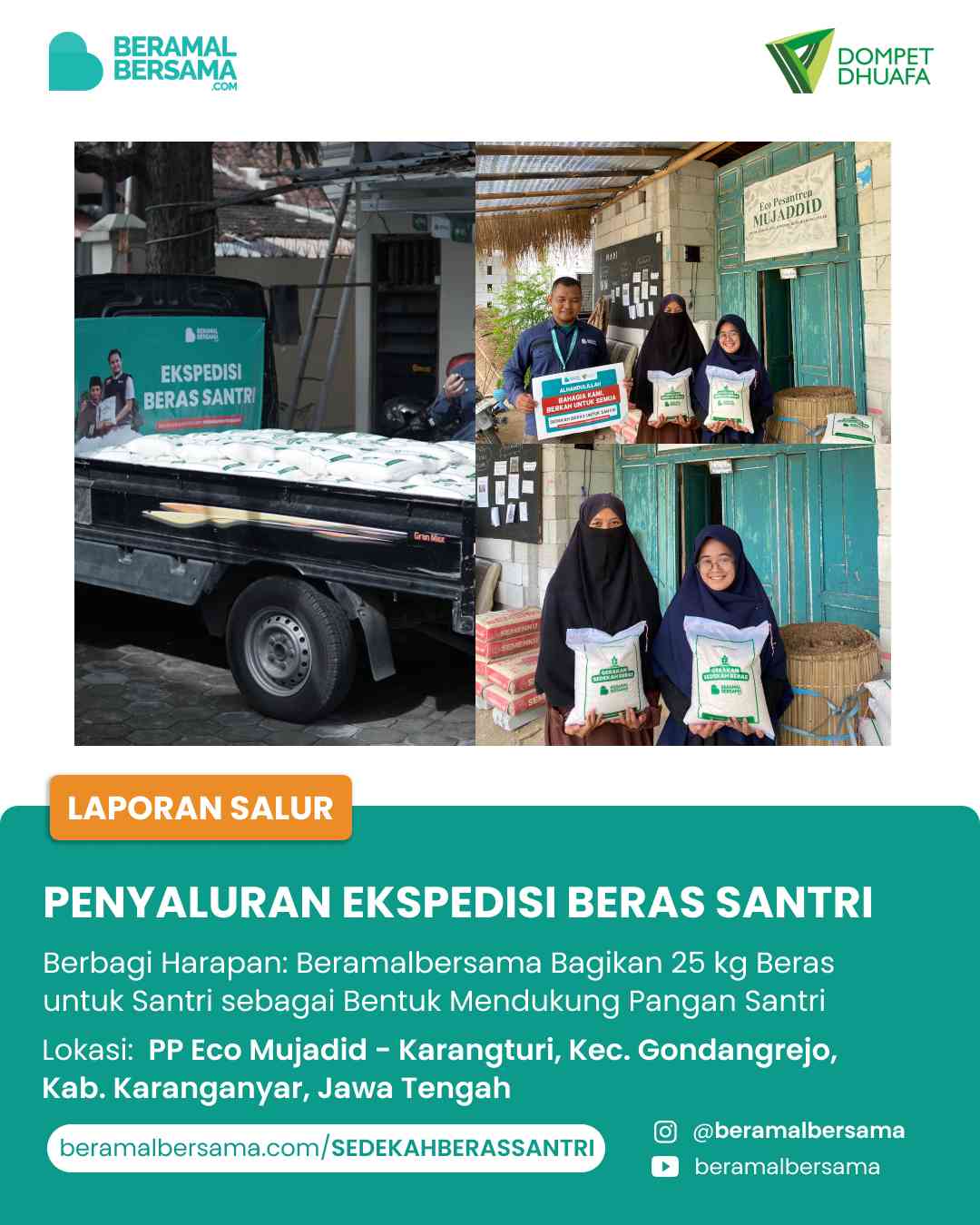 Alhamdulillah atas izin Allah SWT dan dukungan dari SahabatBeramal, kami telah menyalurkan sedekah Sahabat berupa 25 kg beras untuk santri dan asatidz PP Eco Mujadid, Karanganyar.