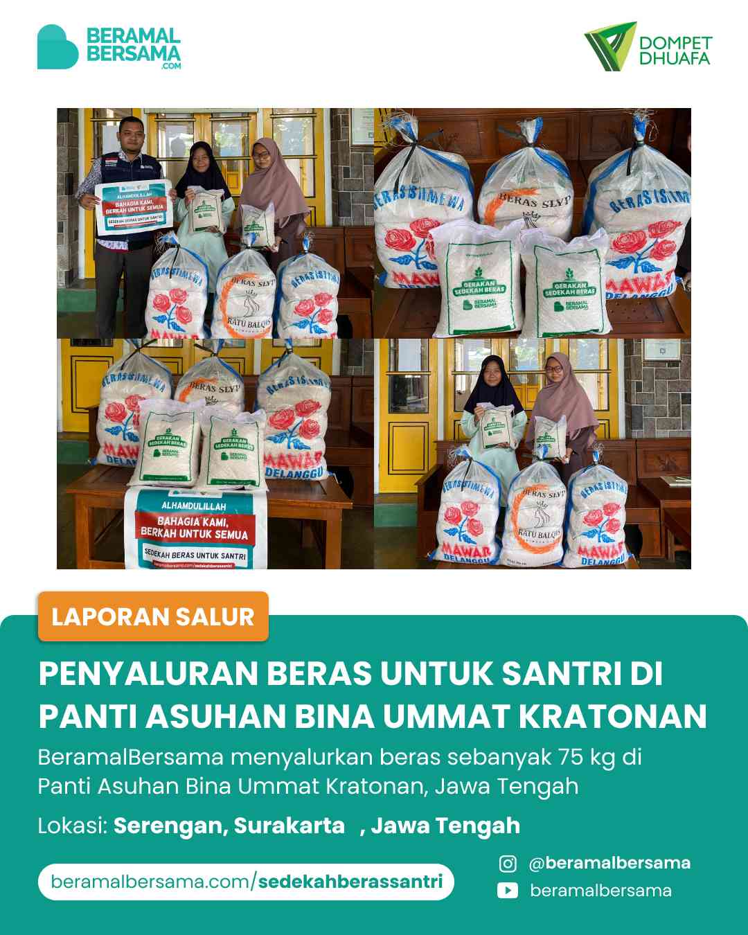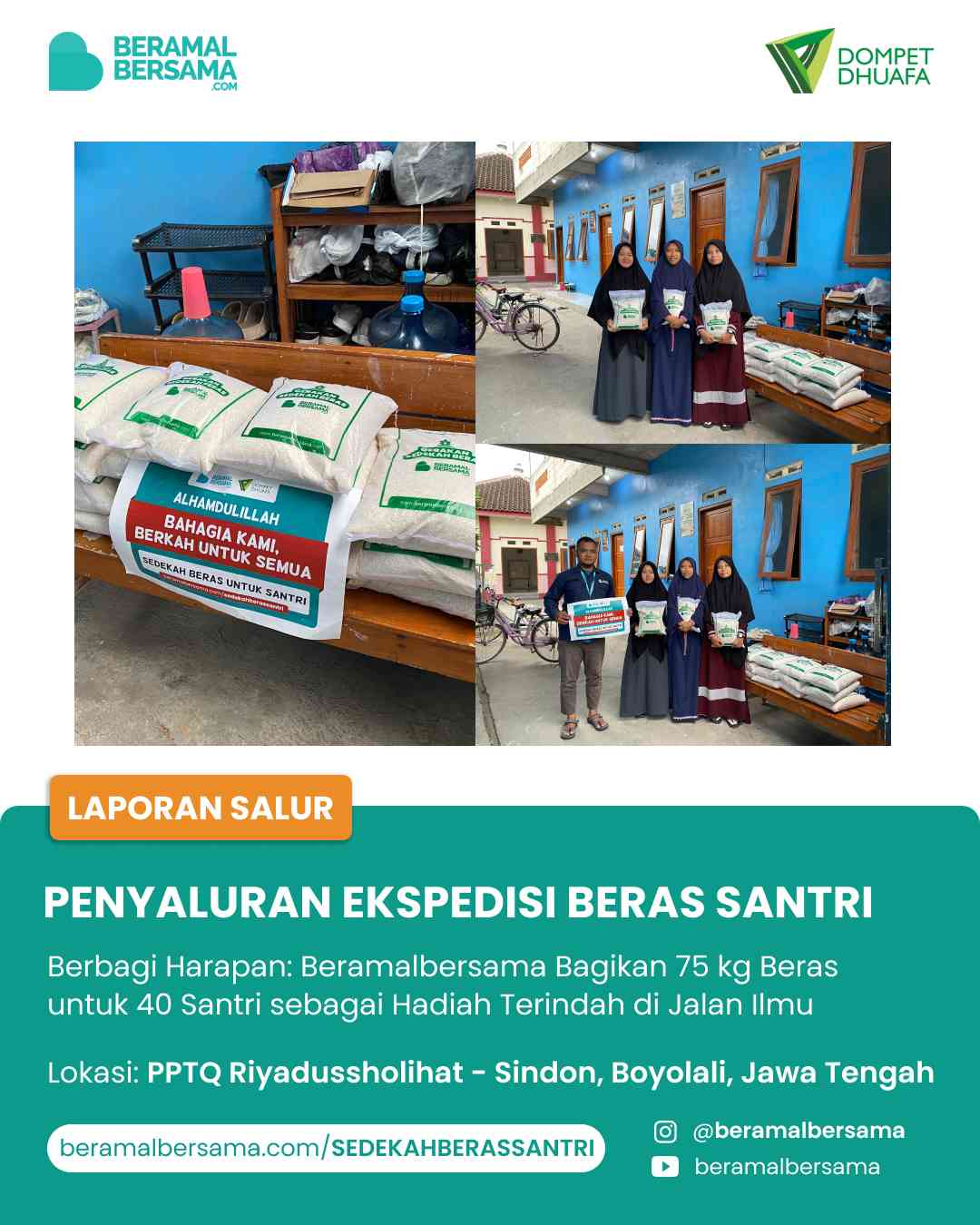 Alhamdulillah atas izin Allah SWT dan dukungan SahabatBeramal, kami telah menyalurkan sedekah Sahabat berupa beras sebanyak 525 kg beras disalurkan guna menunjang pangan santri di beberapa Pondok Pesantren Solo Raya.