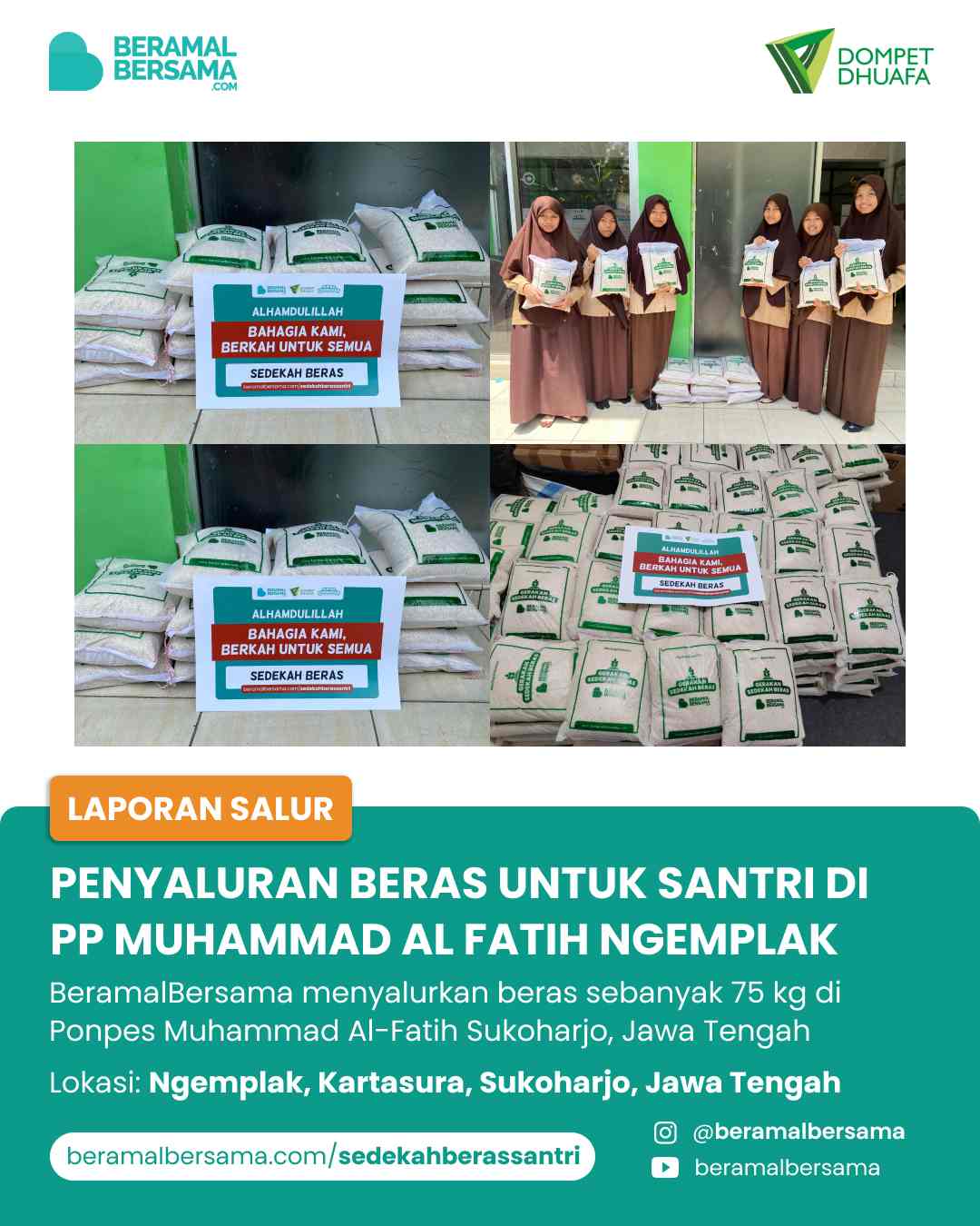 Alhamdulillah atas izin Allah SWT dan dukungan dari SahabatBeramal, kami telah menyalurkan sedekah Sahabat berupa 50 kg beras yang akan dimanfaatkan oleh 165 santri di PP Muhammad Al-Fatih, Sukoharjo, Jawa Tengah.